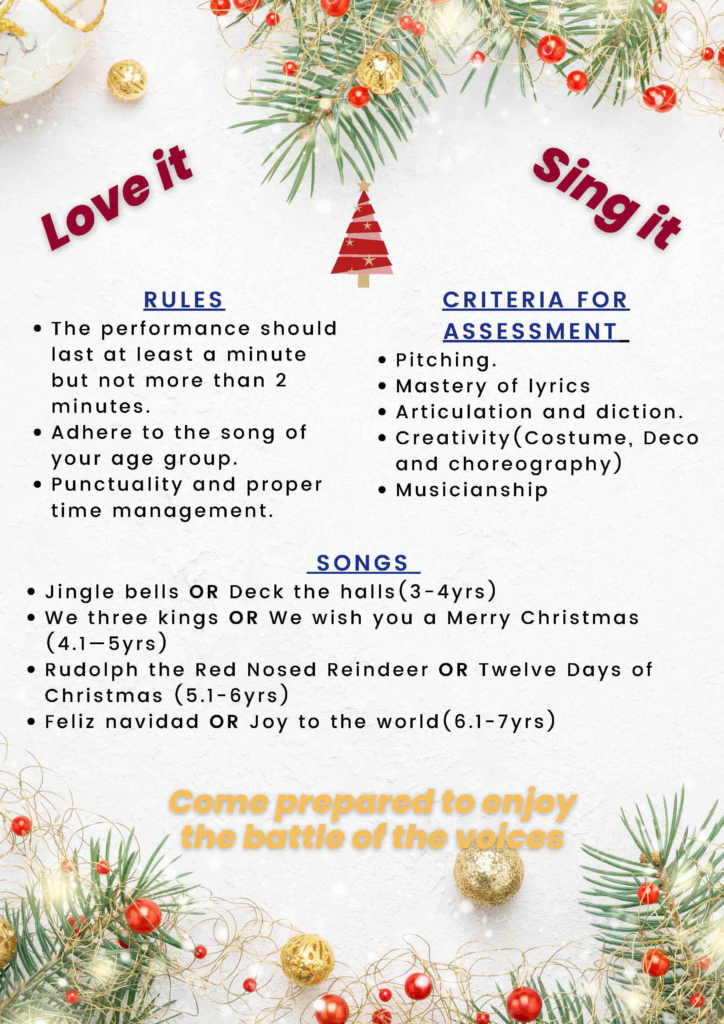 As we come to the end of the year 2022. Do you remember the joy of singing carols during Christmas? The singing of Christmas carols serves as a reminder that God sent us to live a beautiful life and be grateful for being blessed. As the word carol – a joyful song – suggests, carols bring us together and connect us in groups to share experiences and feelings. We at Oshwal Academy Nairobi Nursery invite your child/ren to participate in a Singing Carol Competition on Saturday, 10th December 2022. Participants will be awarded a certificate. The winner’s category will be 1st, 2nd and 3rd positions. It is a great chance to showcase your child’s talent while gaining several benefits, like stage confidence, singing, presentation skills and raise self-esteem. This competition is OPEN for ALL the children living in Nairobi aged 3 to 7 years. Hurry to enroll with a small commitment fee of 150 Ksh before 1st December 2022.