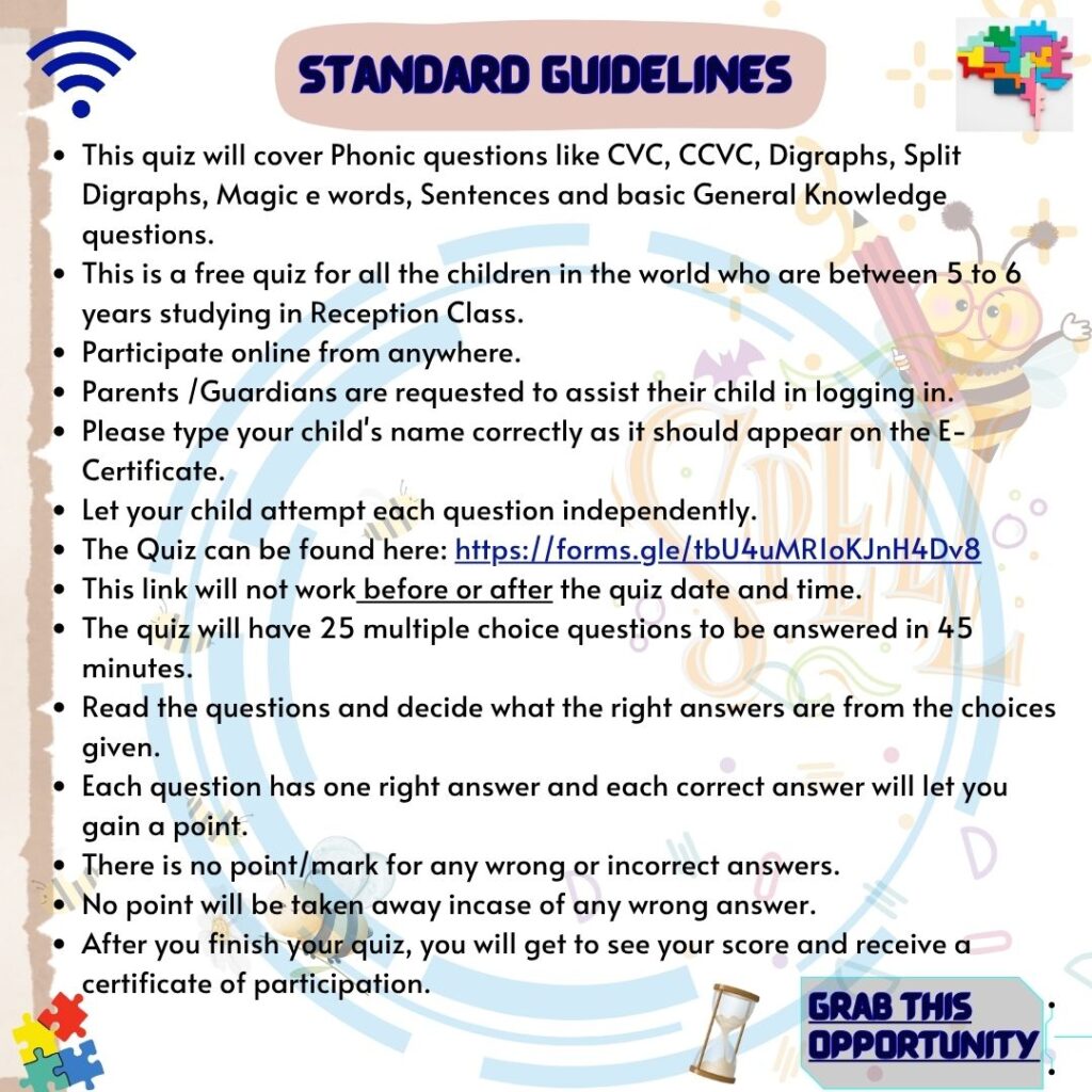 Topics: This quiz will cover Phonic questions like CVC, CCVC, Digraphs, Split Digraphs, Magic e words, Sentences, Articles and basic General Knowledge questions.
