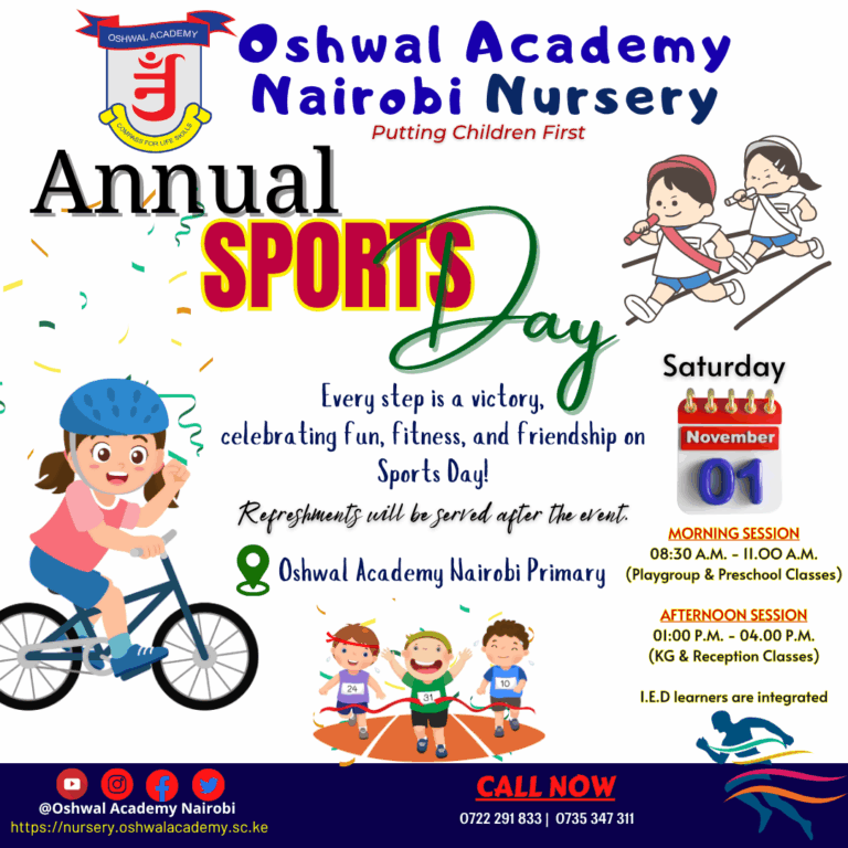 The Oshwal Academy Nairobi Nursery fraternity is delighted to invite you to our Annual Sports Day to be held on Saturday, 1st November 2025, at Oshwal Academy Nairobi Primary Ground. The timings for the
