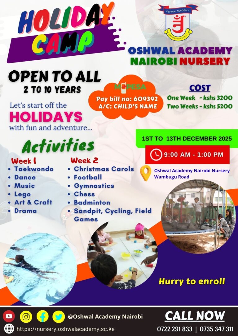 Holiday Camp – DECEMBER 2025Venue: Oshwal Academy Nairobi Nursery ACTIVITIES PER LEARNER:WEEK 1 MUSIC DRAMA LEGO ART & CRAFT DANCE TAEKWONDO WEEK 2 CHRISTMAS CAROLS FOOTBALL GYMNASTICS CHESS BADMINTON/ATHLETICS