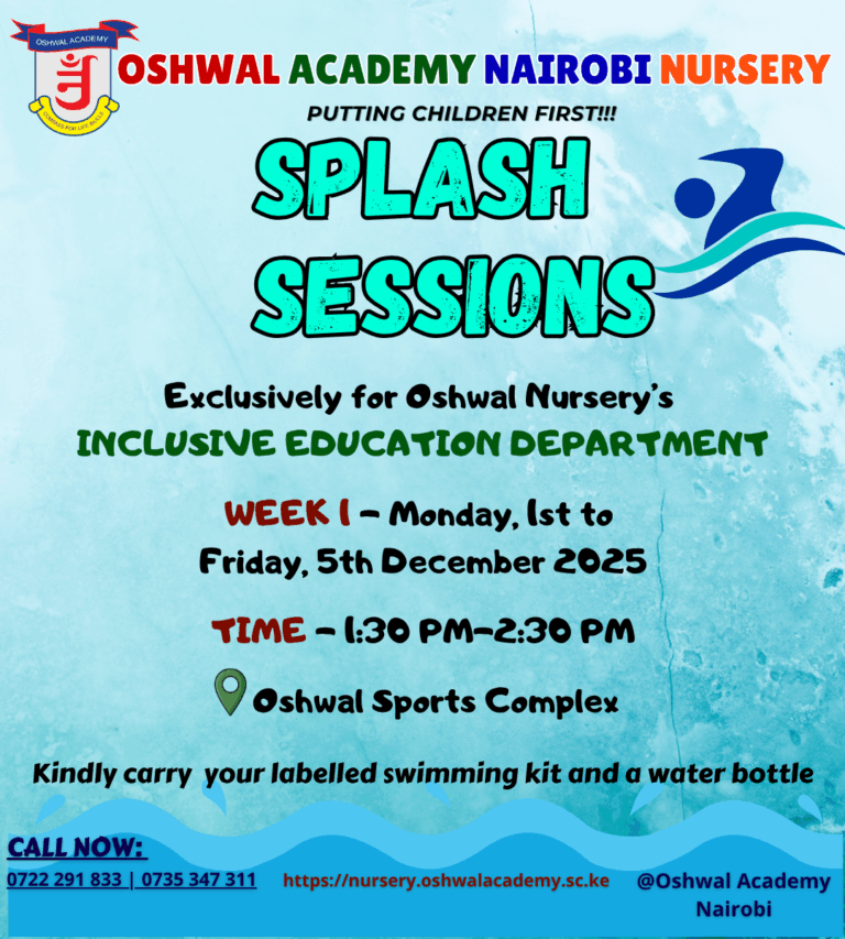 Complimentary Splash SessionsExclusively for Oshwal Nursery’s Inclusive Education Department We are delighted to share that Oshwal Academy Nairobi Nursery, in collaboration with the Oshwal Sports Complex,