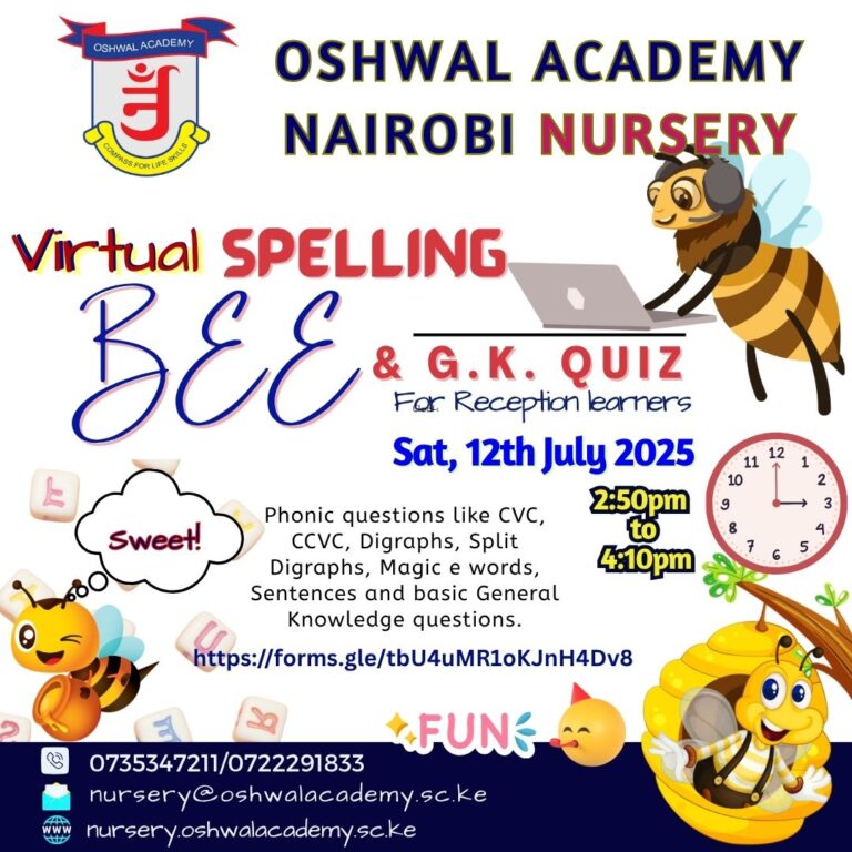 Oshwal Academy will hold a thrilling Virtual Spelling Bee and General Knowledge Quiz! Here are the key details:Event by: Oshwal Academy, Nairobi NurseryAge Group: 5 to 6 years old